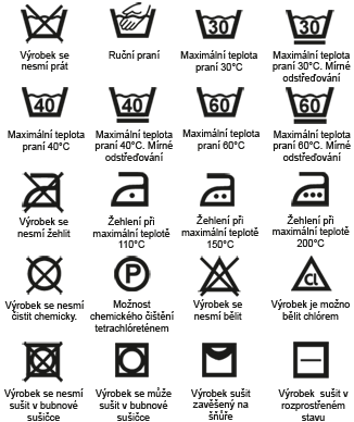 Nejzákladnější z nich jsou uvedeny v obrázku níže. Jsme držitelem licence k používání symbolů údržby oděvů od společnosti SOTEX GINETEX CZ.