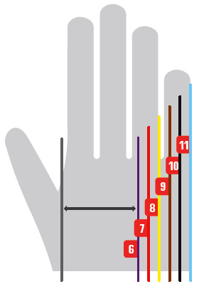Jednou z možností je použití krejčovského metru ke změření šířky dlaně. Měřte v oblasti nad palcem a pod prsty. Délka plochy dlaně (zaokrouhlena na bližší polovinu palce: 1 palec = 2,54 cm), číselně odpovídá průměrné velikosti.